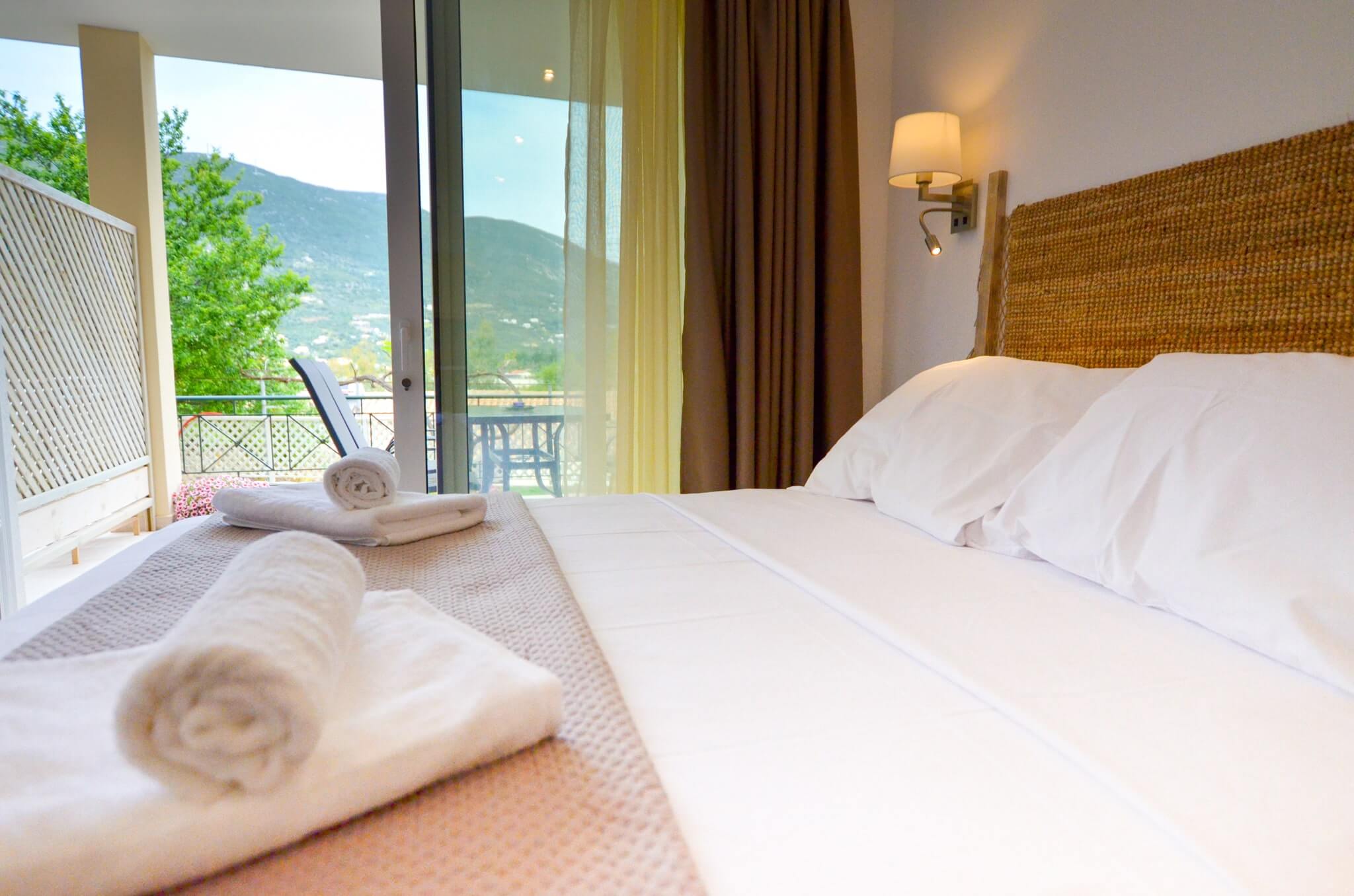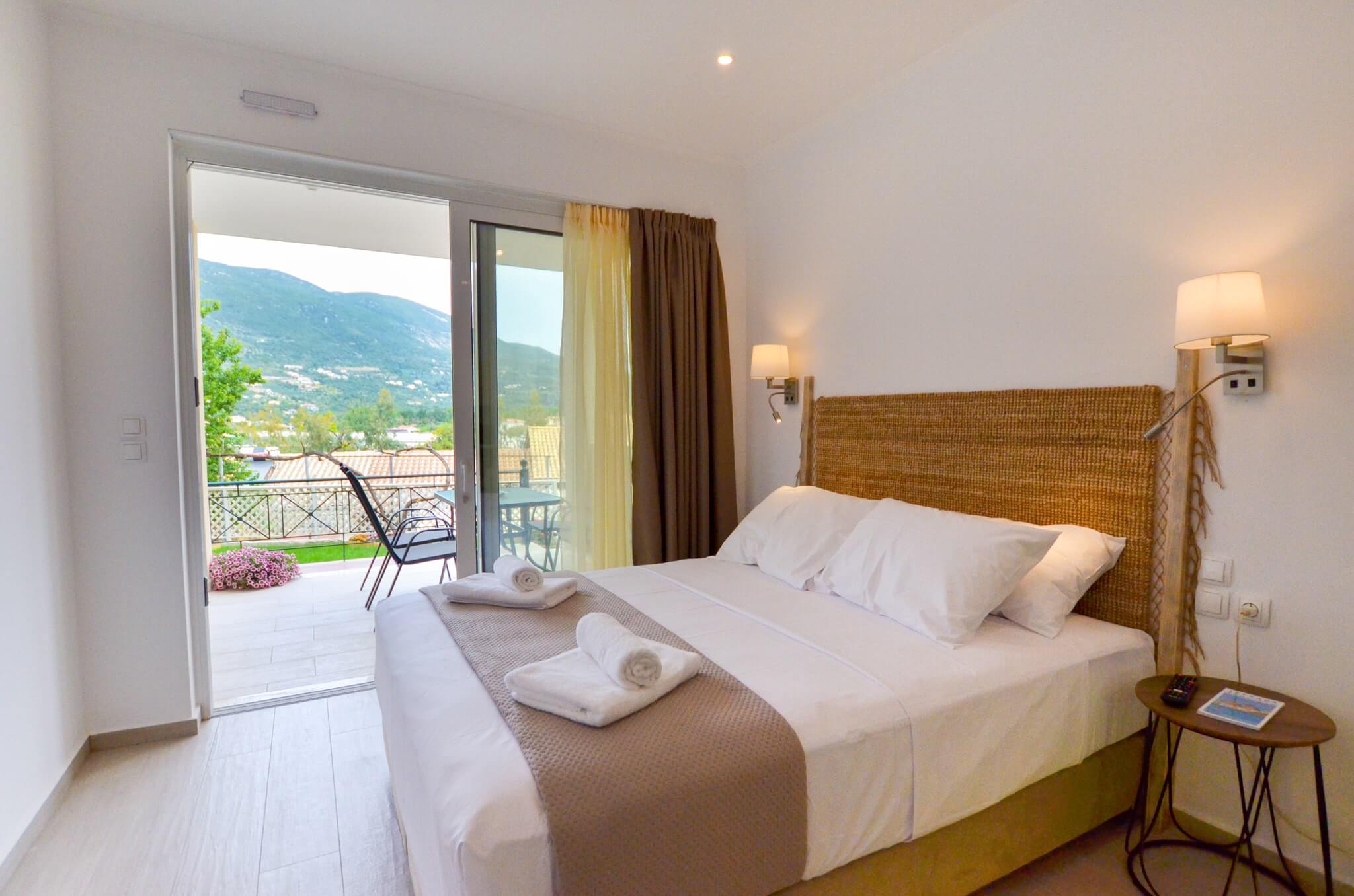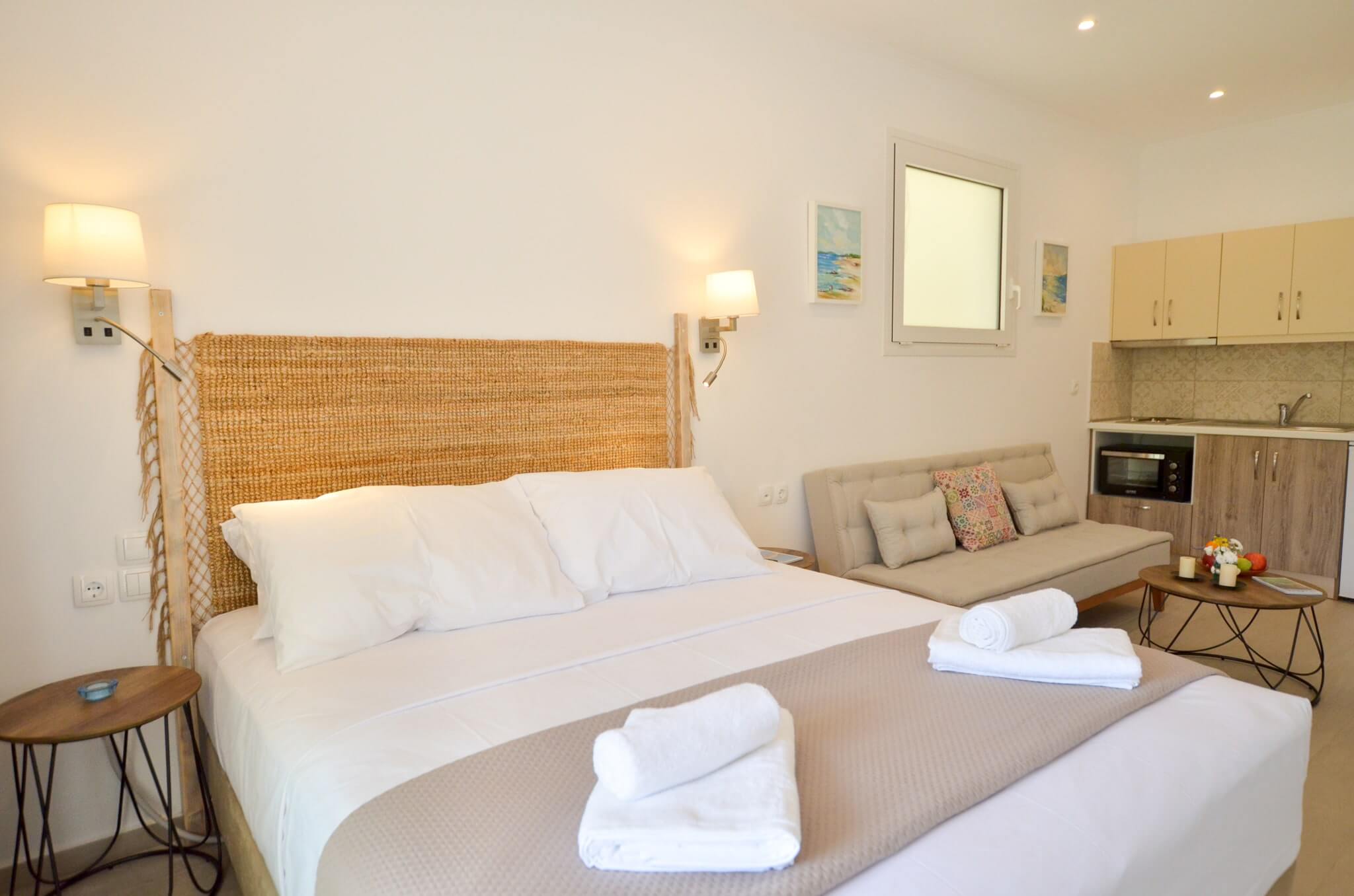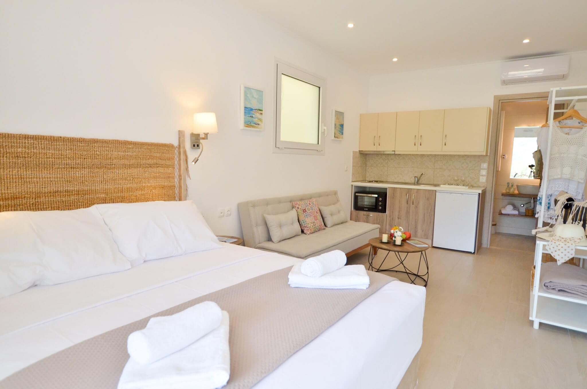 Studio (Ground Floor) is a 26 SQM and is mainly addressed to families of three members, groups or even couples who seek extra space and comfort in their room. The room features a large bed (King size) and a sofa bed. The room is overlooking the village of Vasiliki, has partial sea view and garden view. The large terrace offers a relaxing experience on summer nights.