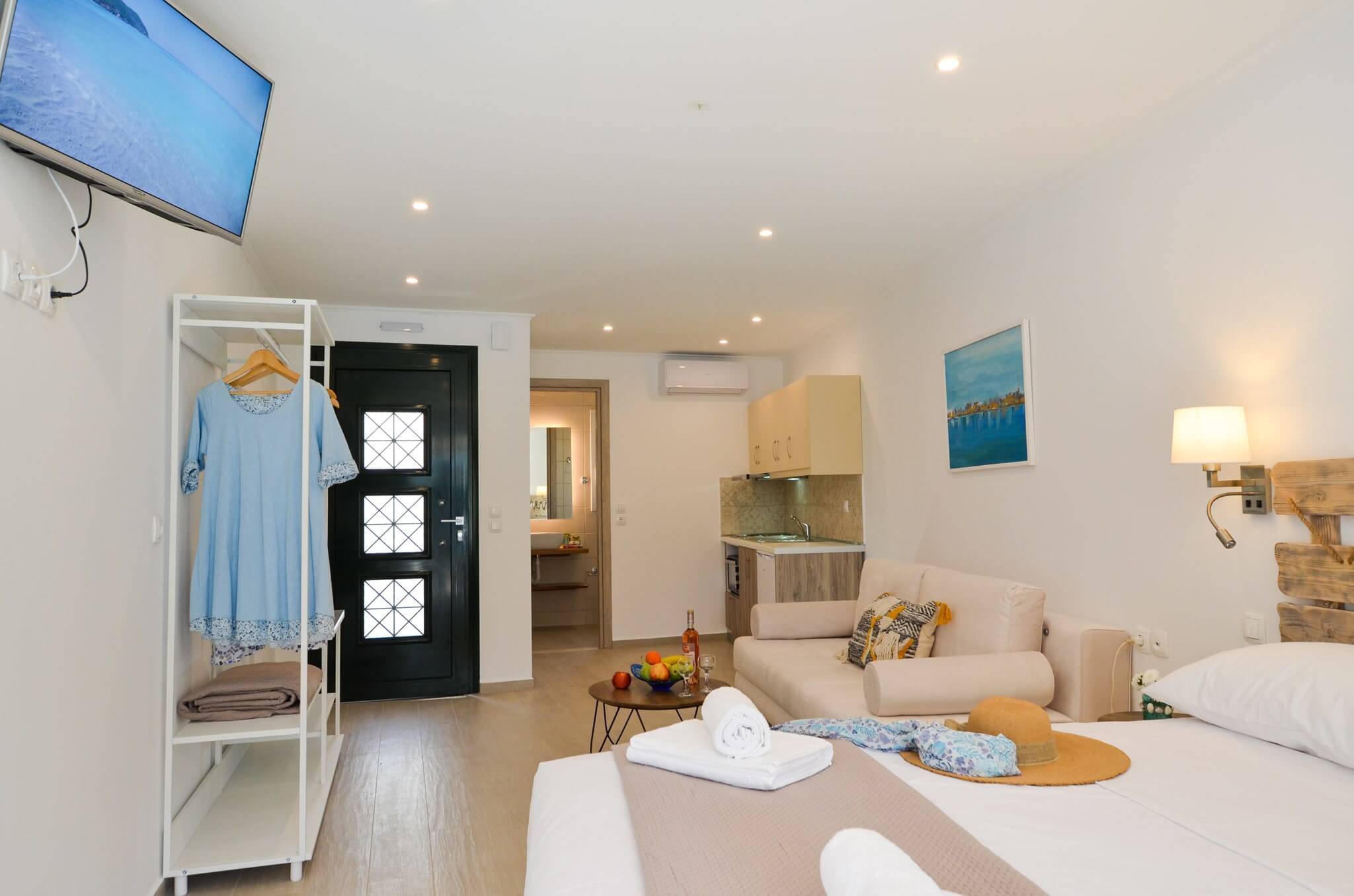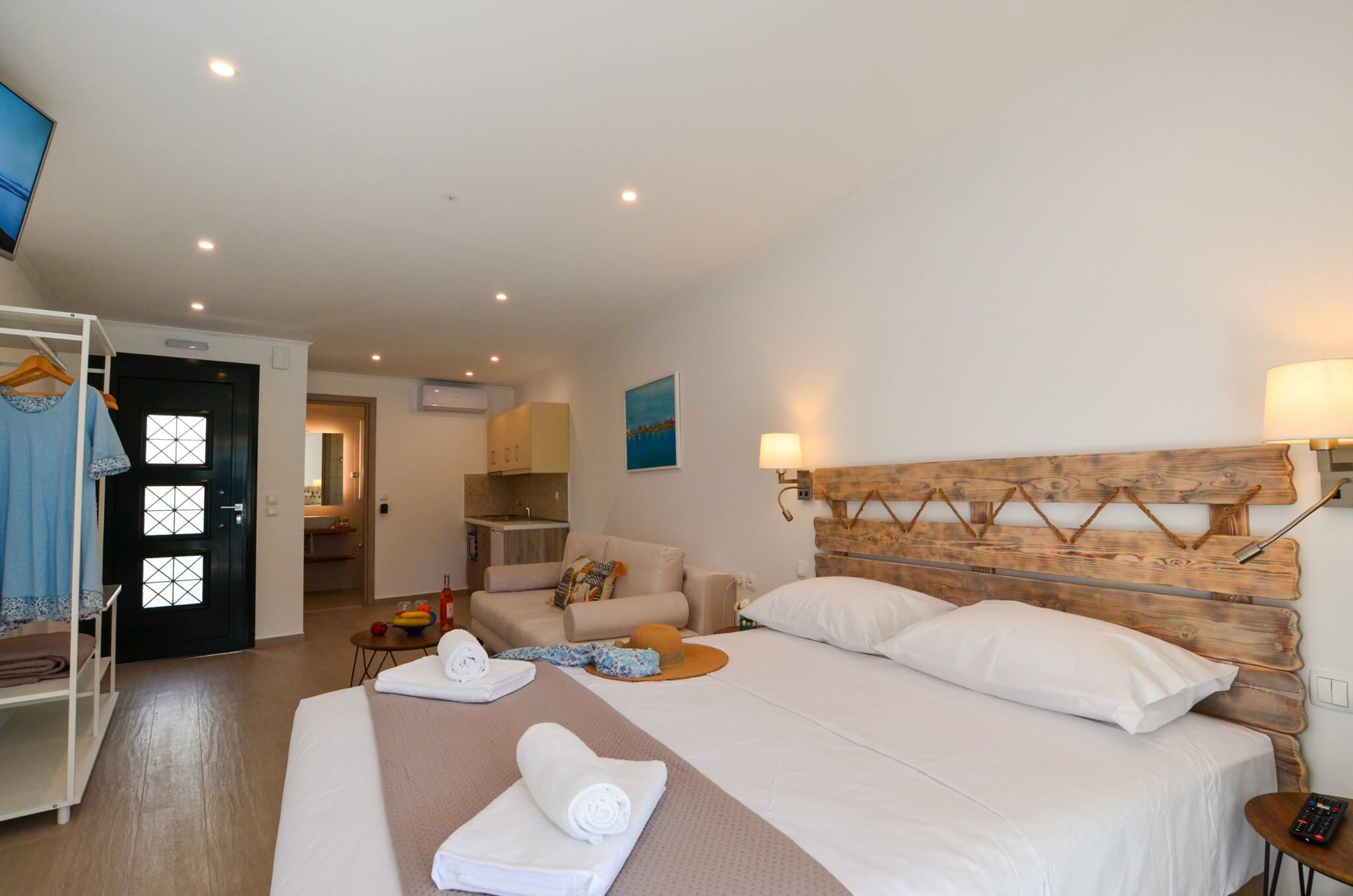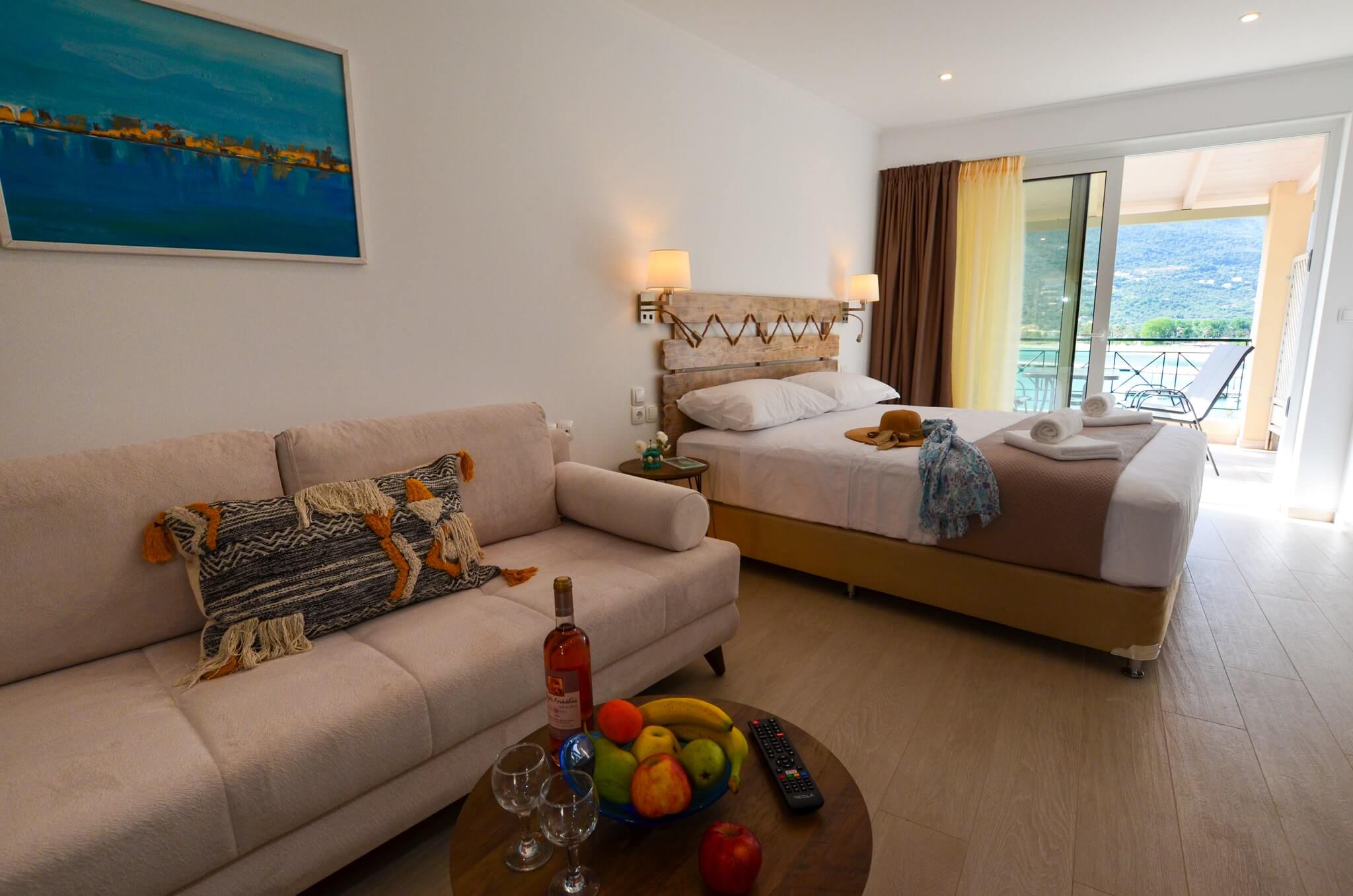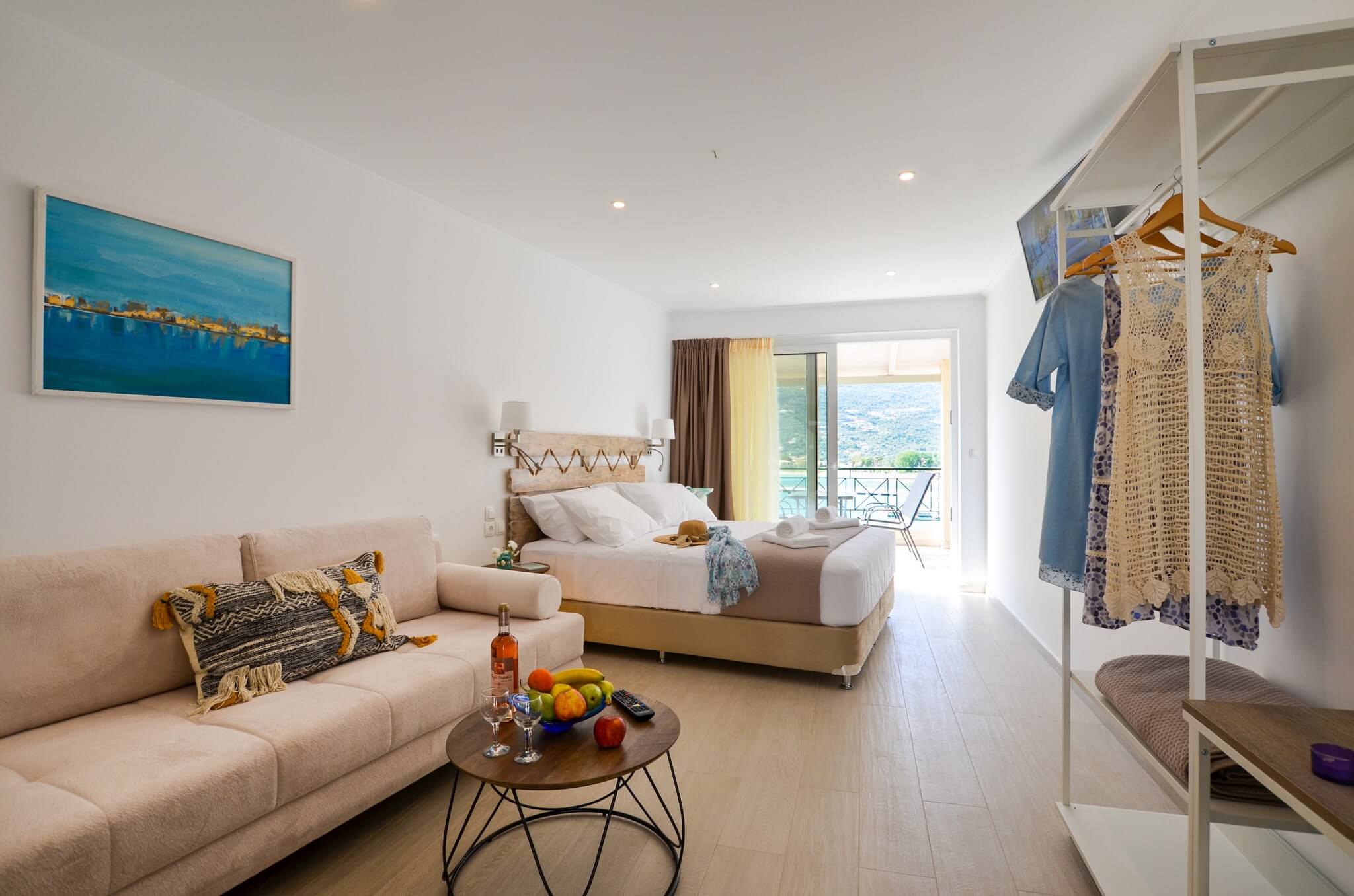 Superior Studio (2nd floor) is a 30 SQM and is mainly addressed to families of three or four members, groups or even couples who seek extra space and comfort in their room. The room features a large bed (King size) and a double size sofa bed. The room is overlooking the village of Vasiliki, has partial sea view and garden view. The large terrace offers a relaxing experience on summer nights.