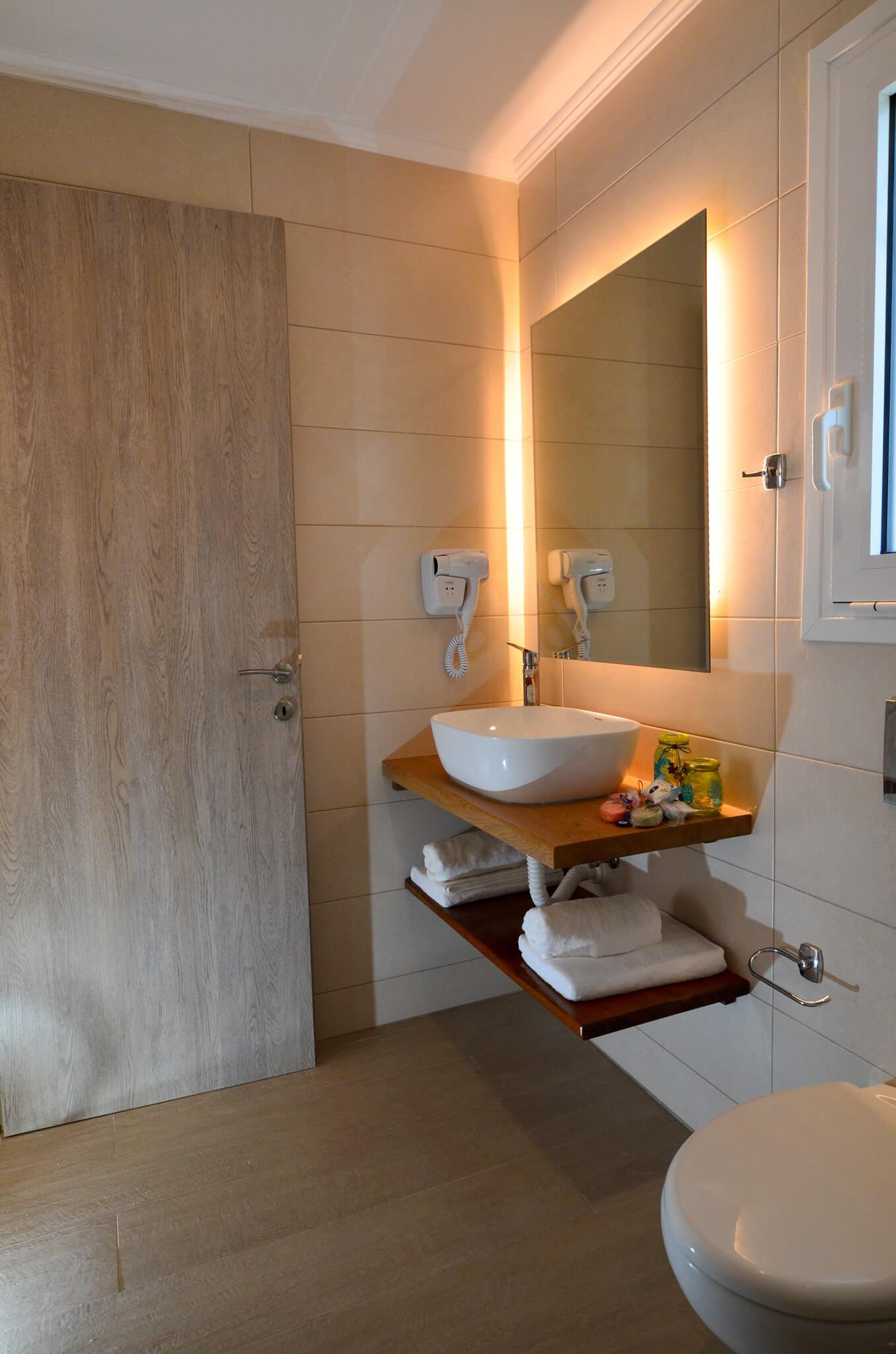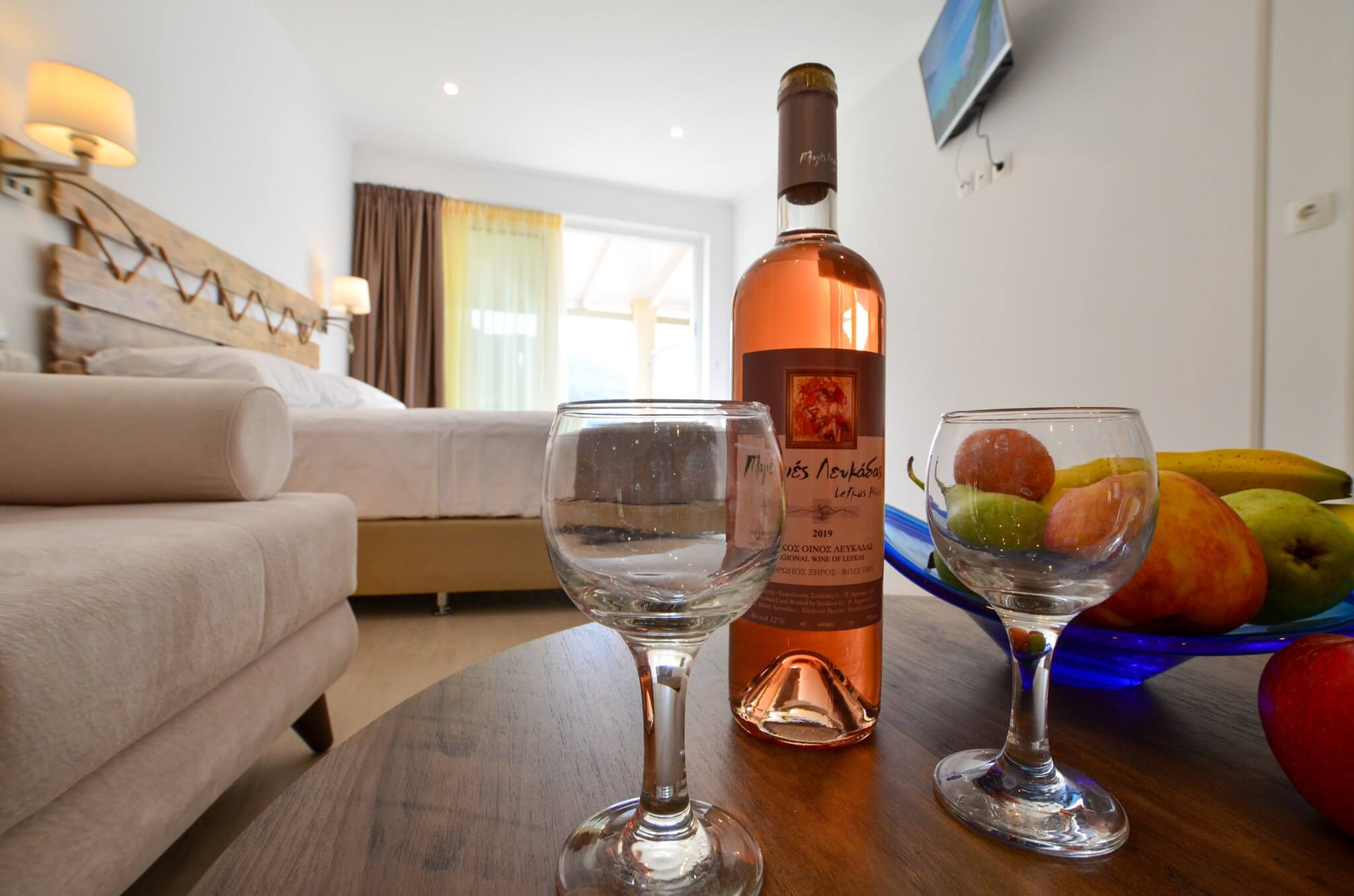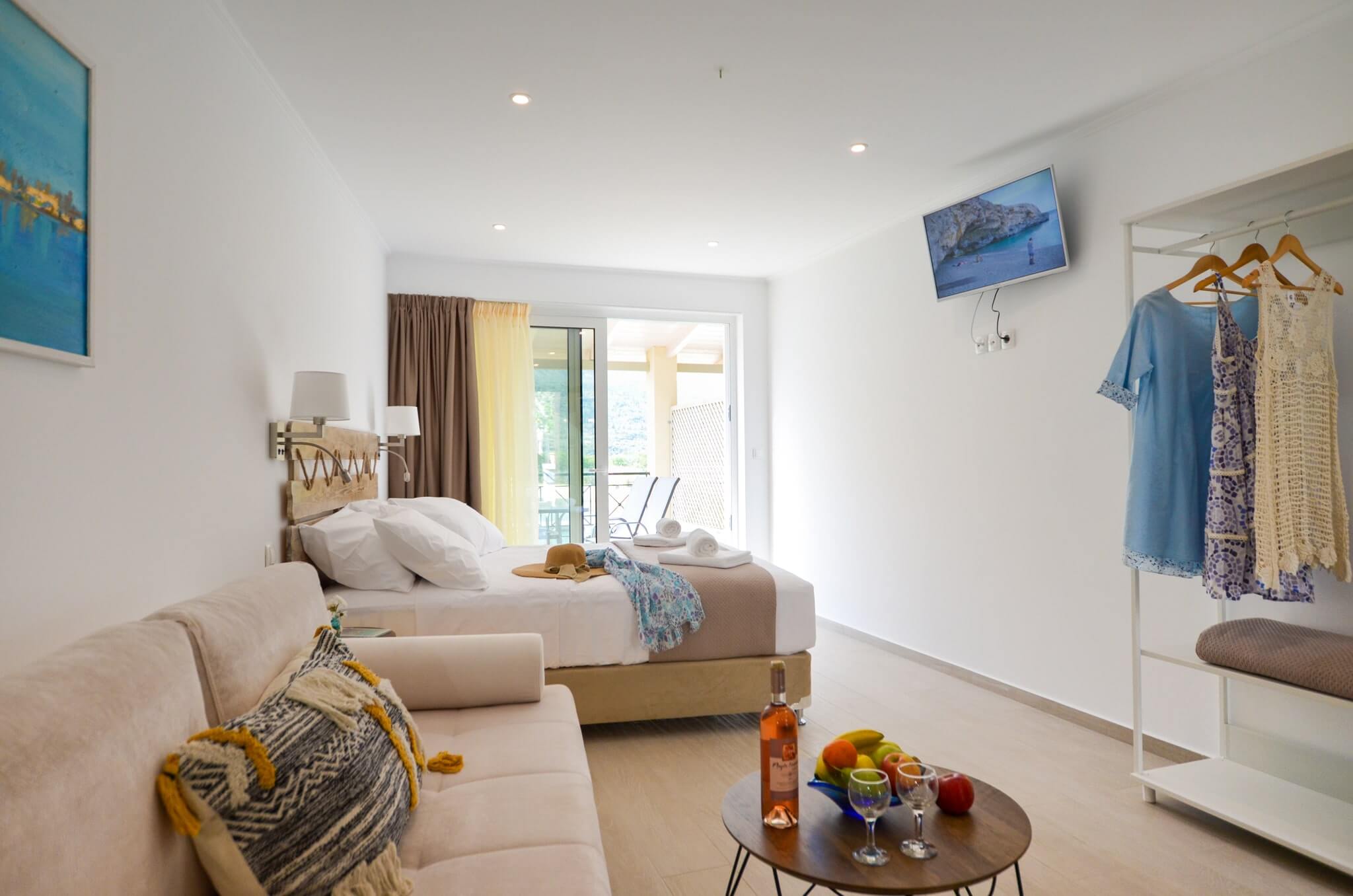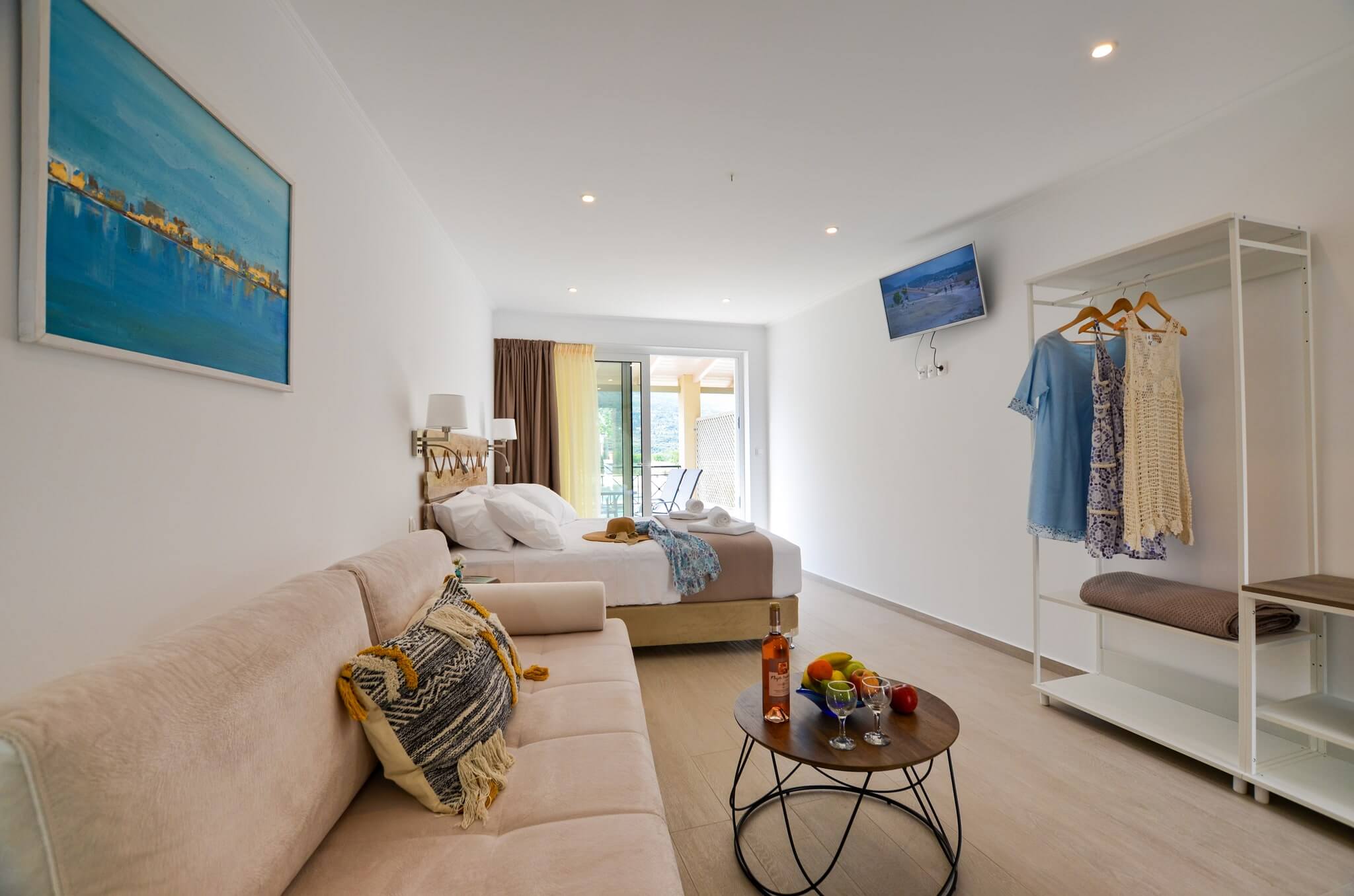 Superior Studio (2nd floor) is a 30 SQM and is mainly addressed to families of three or four members, groups or even couples who seek extra space and comfort in their room. The room features a large bed (King size) and a double size sofa bed. The room is overlooking the village of Vasiliki, has partial sea view and garden view. The large terrace offers a relaxing experience on summer nights.